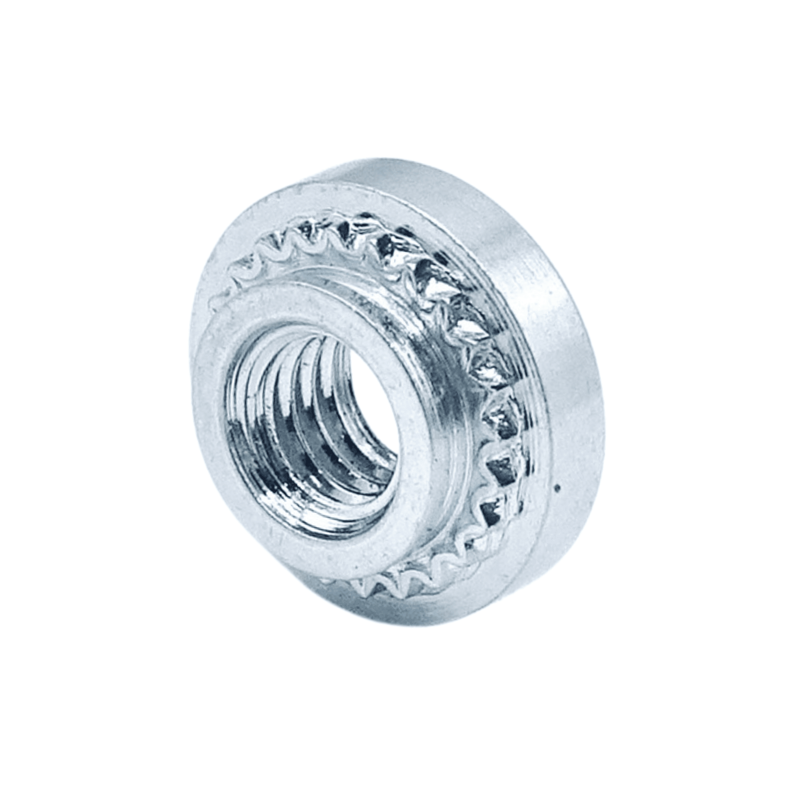 The P-SP SELF-CLINCHING NUT is a threaded fastener which incorporates a knurled platform under the head, which when embedded in the sheet, displaces material into the clinch ring securing the fastener firmly in place.