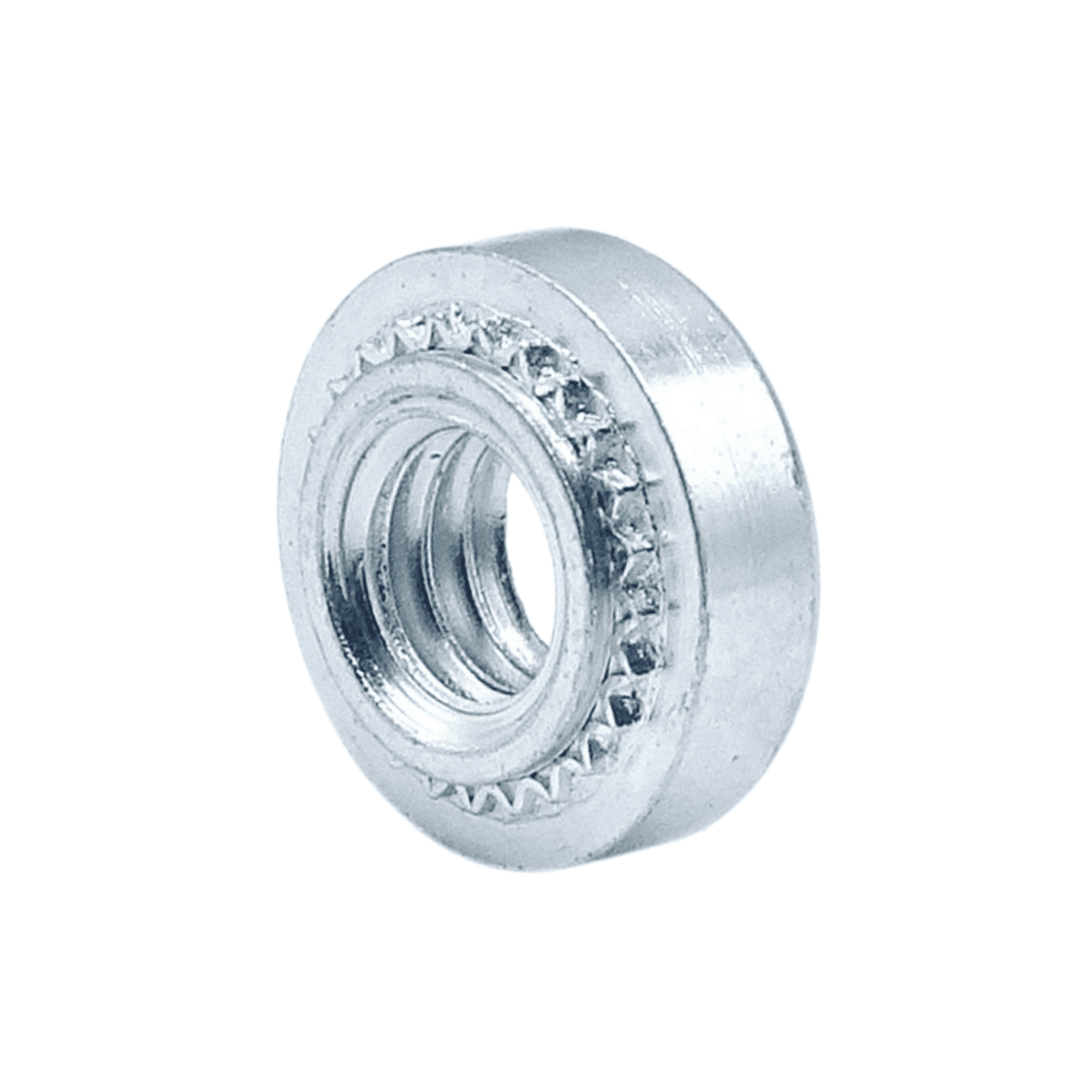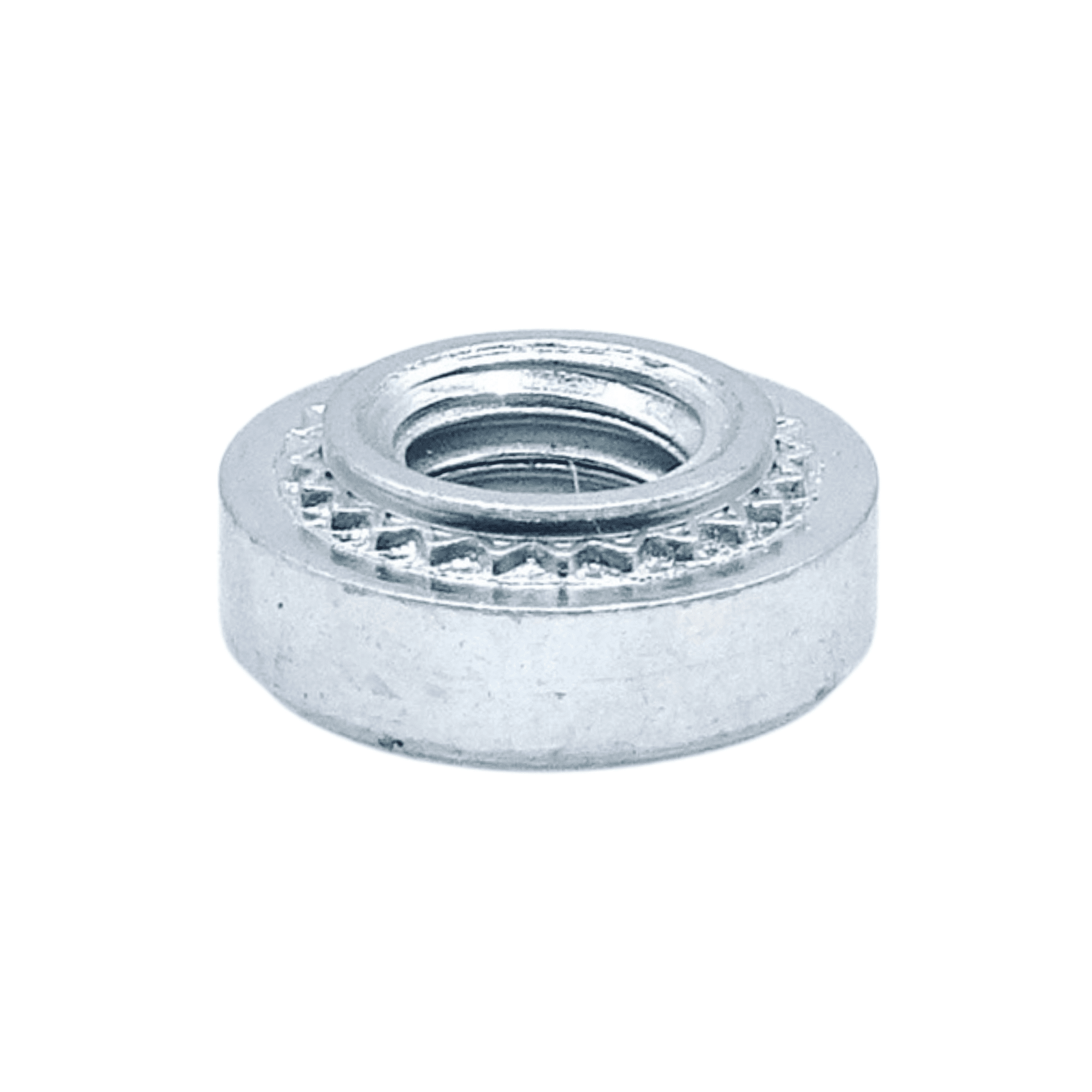 The P-SP SELF-CLINCHING NUT is a threaded fastener which incorporates a knurled platform under the head, which when embedded in the sheet, displaces material into the clinch ring securing the fastener firmly in place.
