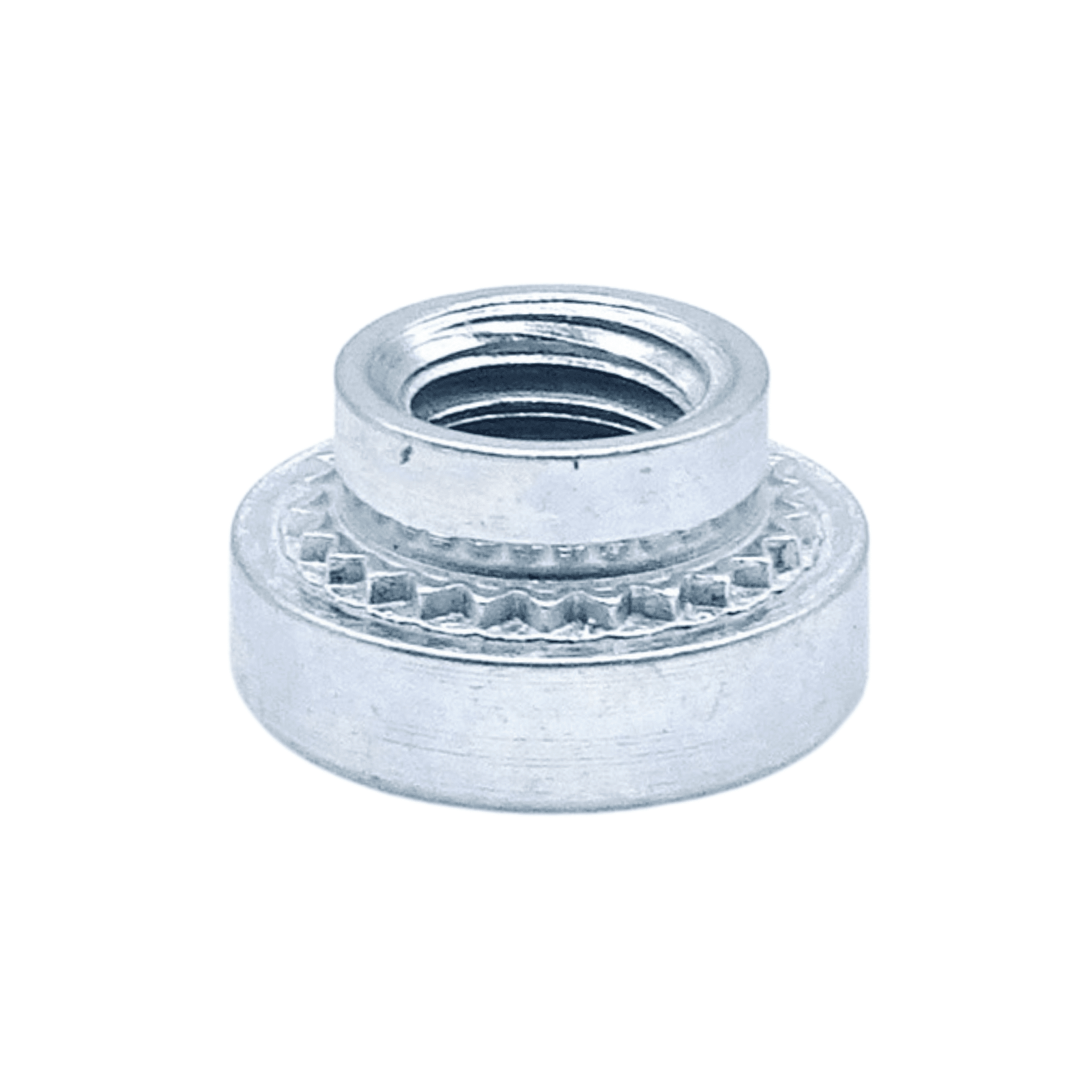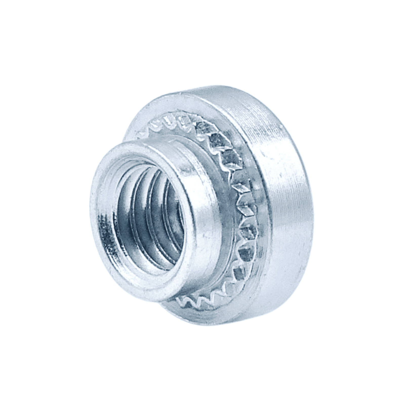 The P-SP SELF-CLINCHING NUT is a threaded fastener which incorporates a knurled platform under the head, which when embedded in the sheet, displaces material into the clinch ring securing the fastener firmly in place.