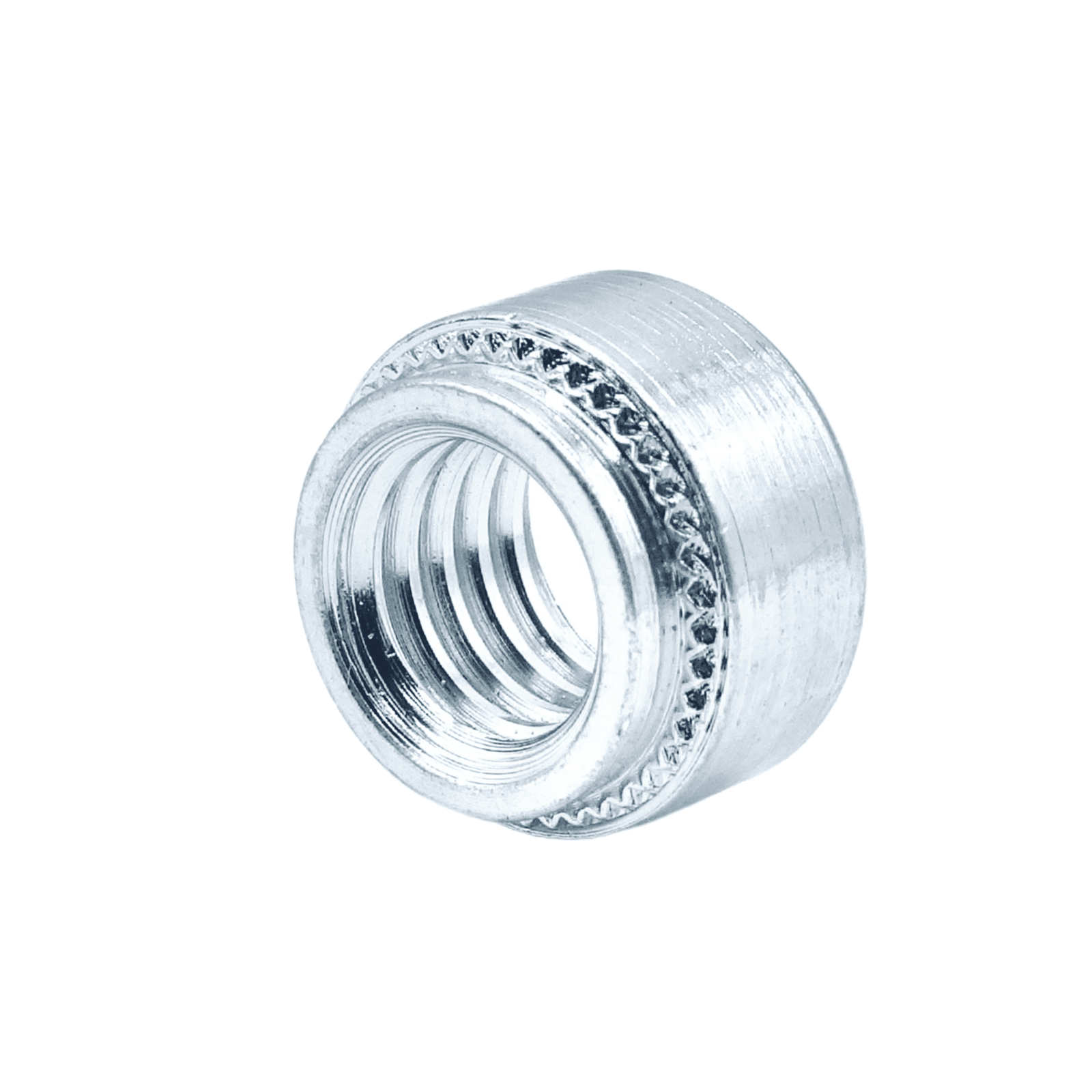 The P-SP SELF-CLINCHING NUT is a threaded fastener which incorporates a knurled platform under the head, which when embedded in the sheet, displaces material into the clinch ring securing the fastener firmly in place.