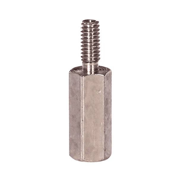 Because these are threaded spacers, they must be aligned squarely between mating parts before tightening to avoid cross-threading or side stresses. Use appropriate torque and wrenching on the hex flats to avoid damaging threads.