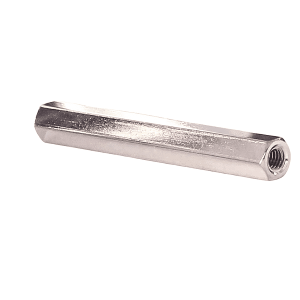 Because these are threaded spacers, they must be aligned squarely between mating parts before tightening to avoid cross-threading or side stresses. Use appropriate torque and wrenching on the hex flats to avoid damaging threads.