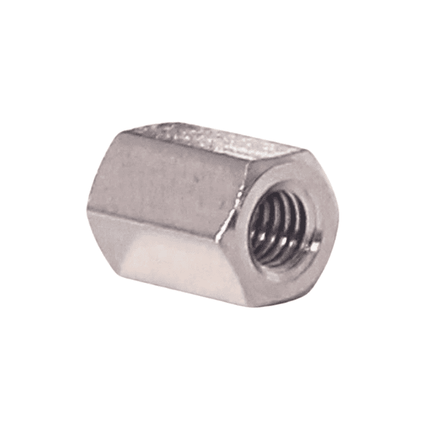 Because these are threaded spacers, they must be aligned squarely between mating parts before tightening to avoid cross-threading or side stresses. Use appropriate torque and wrenching on the hex flats to avoid damaging threads.