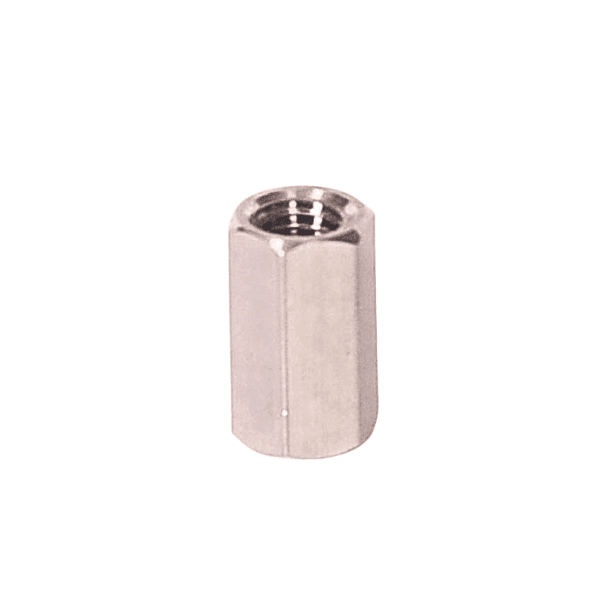 Because these are threaded spacers, they must be aligned squarely between mating parts before tightening to avoid cross-threading or side stresses. Use appropriate torque and wrenching on the hex flats to avoid damaging threads.