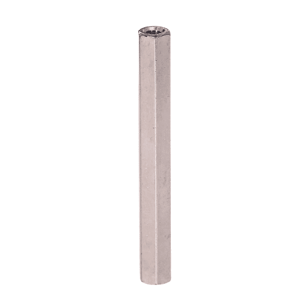 Because these are threaded spacers, they must be aligned squarely between mating parts before tightening to avoid cross-threading or side stresses. Use appropriate torque and wrenching on the hex flats to avoid damaging threads.