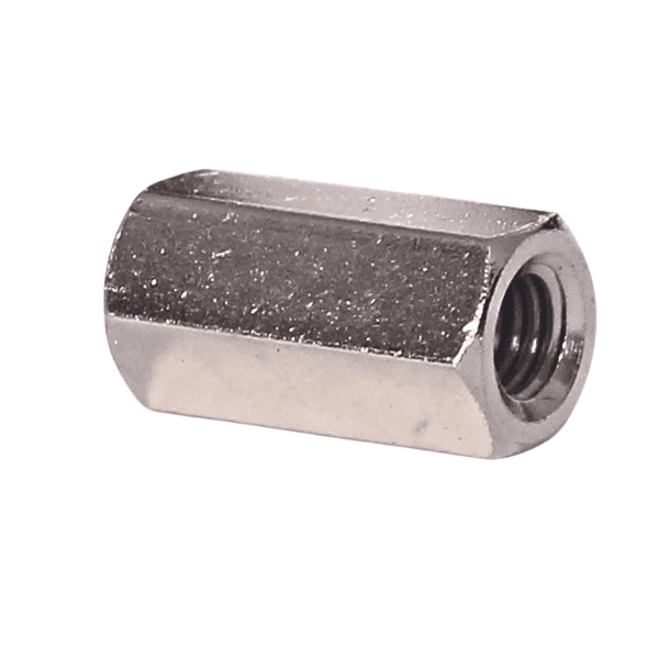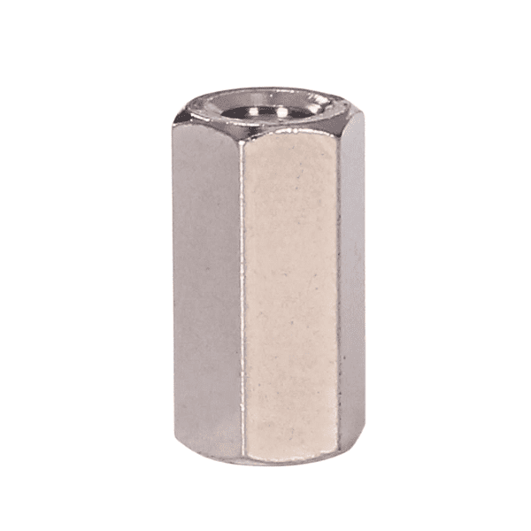 Because these are threaded spacers, they must be aligned squarely between mating parts before tightening to avoid cross-threading or side stresses. Use appropriate torque and wrenching on the hex flats to avoid damaging threads.