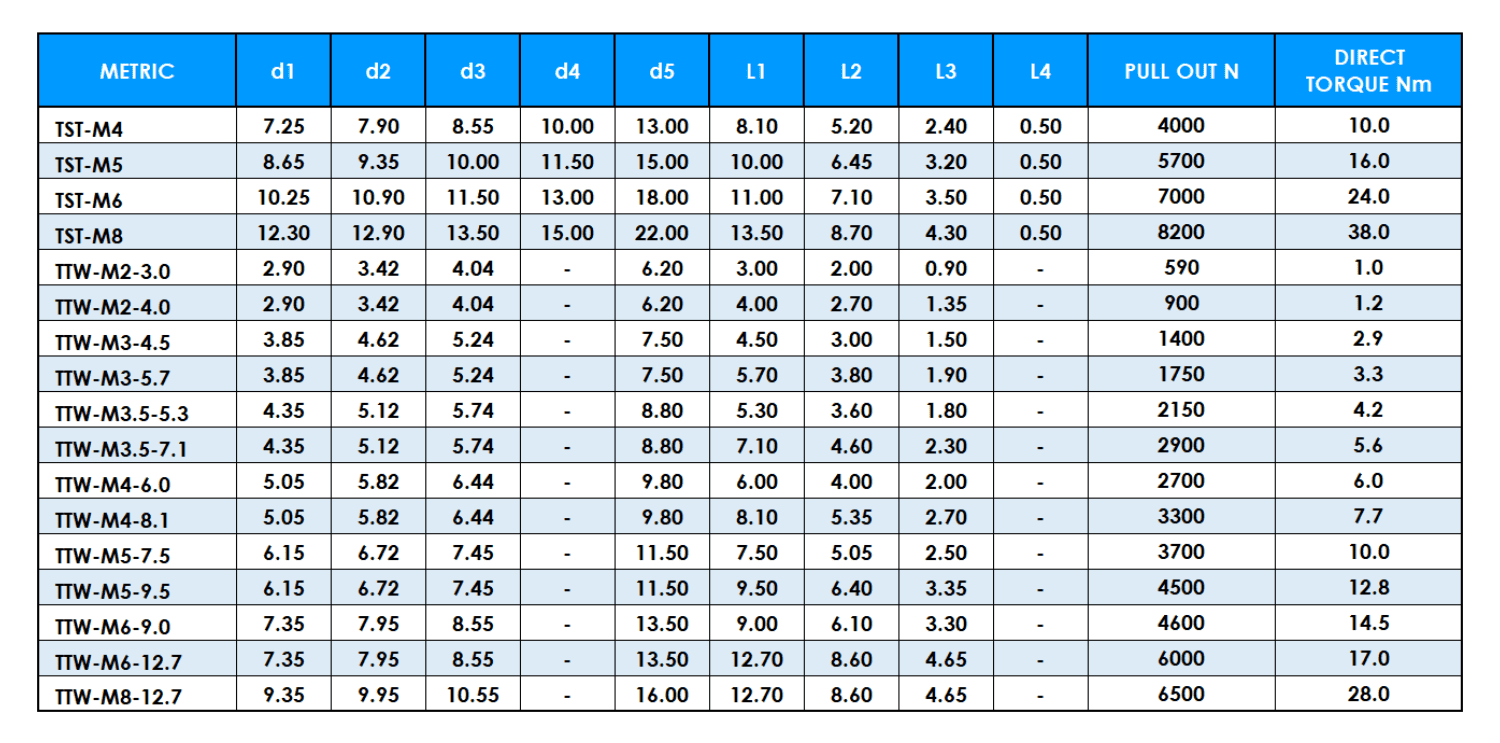 Yes! TRI-STEP™ Inserts are available in a High Strength version (TST) and a Thin Walled version (TTW). The TST is ideal for automotive & industrial applications requiring the highest strength performance. The TTW can replace the majority of commonly used parallel and tapered inserts, including our industry standards as well as commercial equivalents. Additionally, the TTW is available in a Mini Aluminium version that is ideal for notebooks and other hand-held consumer electronics. (Mini Aluminium Insert data is available on our website.)